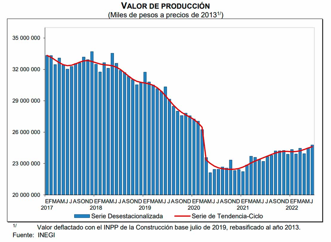 En su comparación anual, el valor real de la producción de las empresas constructoras subió 6.8% en junio del 2022, con respecto al mismo mes del año anterior.