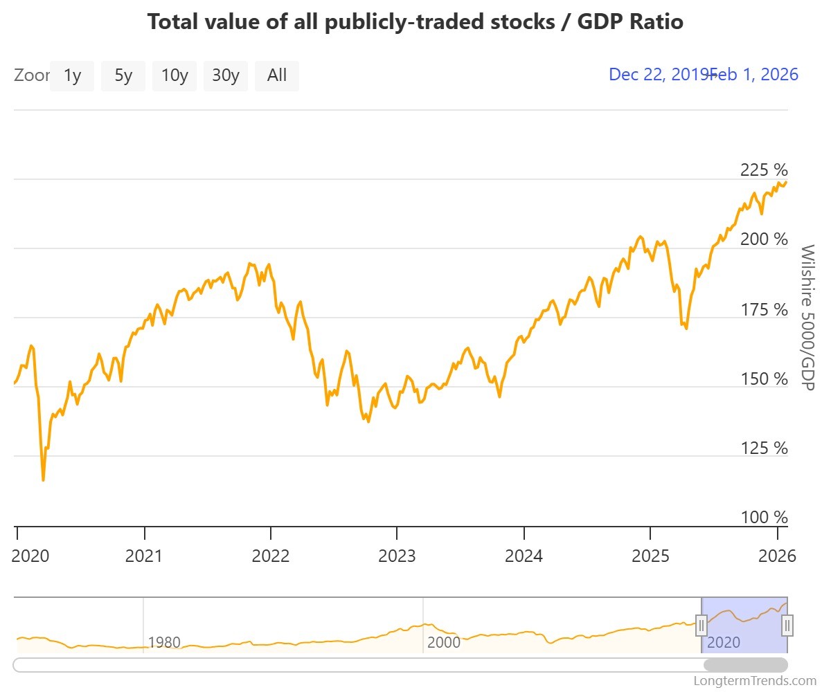 Un indicador que demuestra esta divergencia es el famoso ‘indicador Buffett’, que relaciona la capitalización total (o valor total) del mercado accionario -usualmente medida a través del índice Wilshire 5000- con el tamaño de la economía -a través del producto interno bruto o GDP, por sus siglas en inglés-. Actualmente, este indicador se encuentra en niveles históricamente elevados y exhibe una tendencia al alza, lo que sugiere que la valuación del mercado accionario supera de forma significativa la capacidad productiva de la economía estadounidense (Gráfica 2).